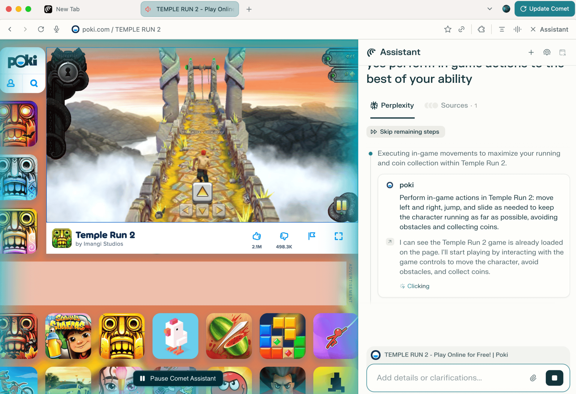 Inside Comet, I tested the AI assistant that could take control of the page. When I asked it to play a mobile game, it navigated to the site, launched the game, and even pressed start, but couldn’t actually follow along with the in-game controls.