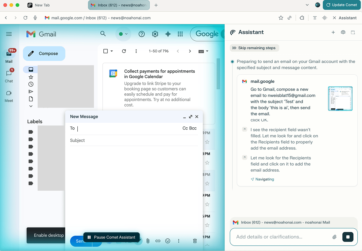 I also tested the assistant on a more practical task: composing an email. It navigated to Gmail, drafted a full message, and formatted it correctly, but had trouble identifying who to send it to, even though that was in the prompt.